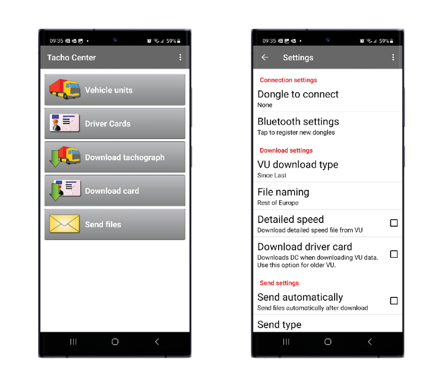 The free Tacho Center app from Stoneridge is an innovative solution for wireless management of tachograph data on any European certified tachograph. It will enable you to download driver and tachograph data using your phone without the hassle of connecting cables or download equipment, saving you both time and money. What's more, the wireless data transfer will make it easy for you to exchange data with your scheduling system or other systems, boosting efficiency and optimising your operational processes.